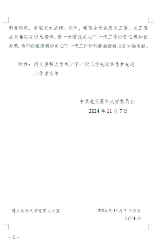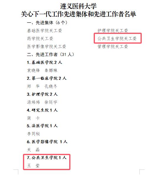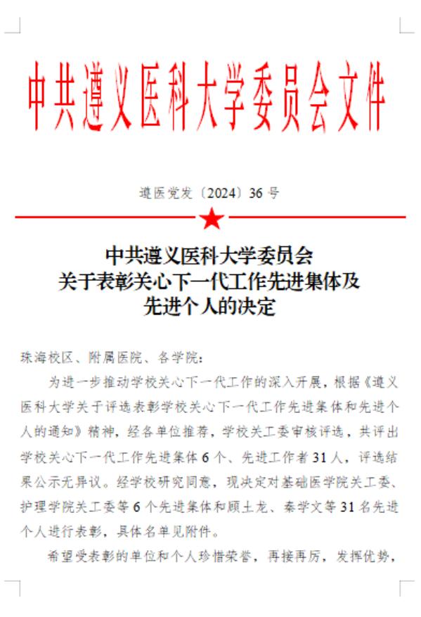 近日,根据《中共太阳成集团tyc151cc委员会关于表彰关心下一代工作先进集体及先进个人的决定》遵医党发〔2024〕36号文件精神,太阳成集团tyc151cc关工委荣获太阳成集团tyc151cc关心下一代工作先进集体(全校共6个),王莹老师荣获先进工作者称号。