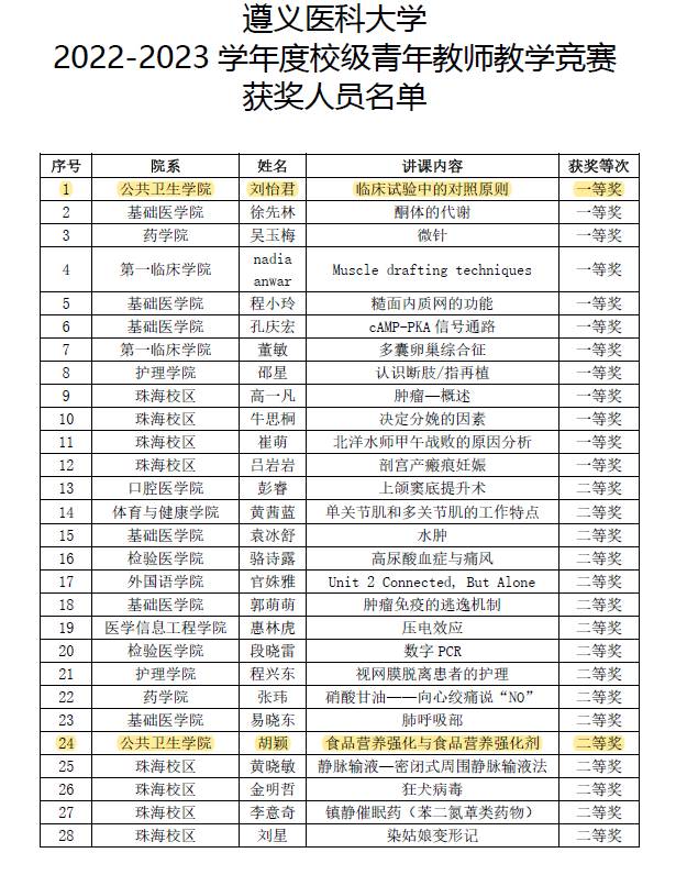近日,2022-2023学年太阳成集团tyc151cc青年教师教学竞赛及优秀课堂教师成绩公布结果,公司刘怡君老师喜获青年教师教学竞赛一等奖,胡颖老师喜获青年教师教学竞赛二等奖;张怡、刘怡君两位老师喜获本科课堂教学优秀教师称号。