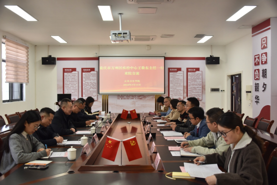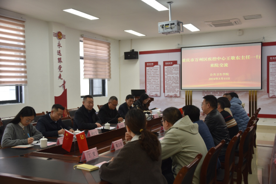 3月11日下午,重庆市万州区疾控中心党委副书记、主任王敬东一行6人来院开展“加强校地合作 深化人才培养”交流座谈会。公司党委班子成员、内设科室负责人、教研室负责人及辅导员参加座谈。公司党委委员石修权主持座谈会。